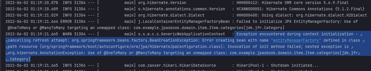 Exception encountered during context initialization - cancelling refresh attempt: org.springframework.beans.factory.BeanCreationException: Error creating bean with name 'entityManagerFactory' defined in class path resource [org/springframework/boot/autoconfigure/orm/jpa/HibernateJpaConfiguration.class]: Invocation of init method failed; nested exception is org.hibernate.AnnotationException: Use of @OneToMany or @ManyToMany targeting an unmapped class: com.example.jpasbook.domain.item.Item.categories[jdk.jfr.Category]